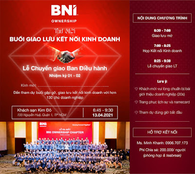 Từ đó, giúp doanh nghiệp có cơ hội kết nối kinh doanh quảng bá đến hơn 80 quốc gia với 10.000 Chapter - 275.000 thành viên, doanh thu 16.2 tỷ đô la Mỹ trên hệ thống của BNI Toàn Cầu. Và cơ hội kết nói với BNI Việt Nam với 138 Chapter – 6.165 thành viên, doanh thu 7.007 tỷ đô la Mỹ.