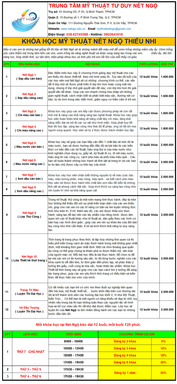 Hiện tại trung tâm mỹ thuật tư duy Nét Ngộ đang khai giảng các lớp dạy vẽ tại quận Bình Thạnh, Gò Vấp, Tân Phú, quận 2, 9, 12 TP HCM.
