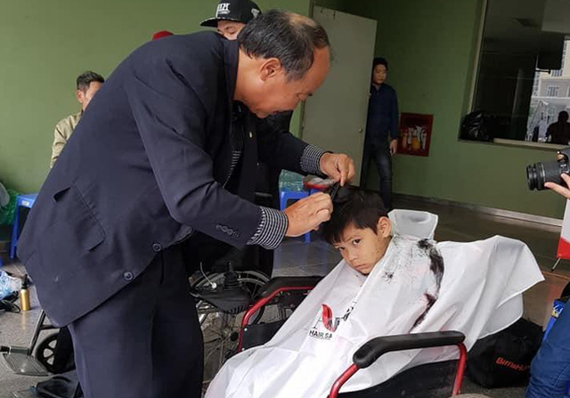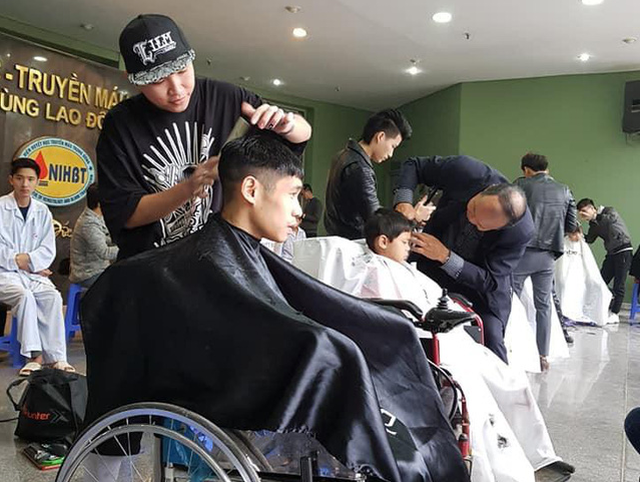 Thợ cắt tóc chuyên nghiệp đã đến Viện Huyết học truyền máu T.Ư cắt tóc, làm đẹp cho người bệnh đón tết . Ảnh: Bệnh viện cung cấp