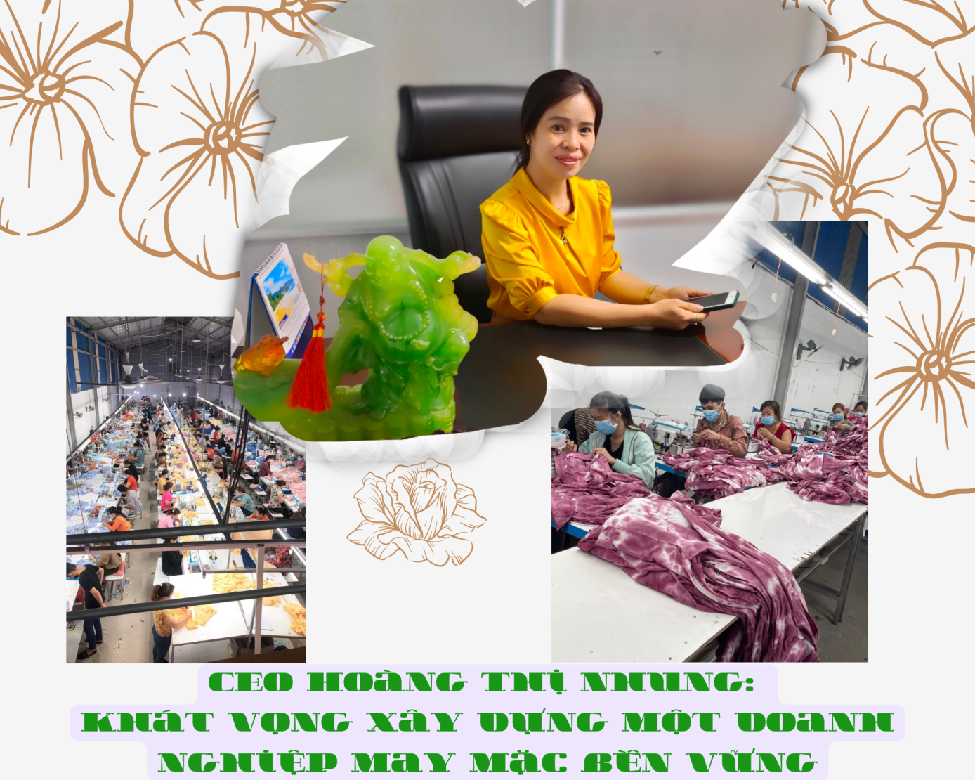 Rồi cả một vấn đề dịch bệnh Covid-19 vừa qua, “cơn bão” đó cần một người chủ nhiều quyết tâm đưa doanh nghiệp của mình vượt qua những khó khăn trong tâm bão lớn. “Chúng tôi đã bù lỗ rất lớn trong dịch và giờ là lúc chúng tôi bắt đầu quay lại nhận những đơn hàng gia công xuất đi nước ngoài hoặc trong nước. Chúng tôi chỉ biết làm hết sức mình có thể để giúp đỡ mọi người ở đây. Rất mong mỏi bạn bè anh em biết và kết nối giúp chúng tôi có nguồn hàng để ổn định sản xuất và tôi tin vào quy luật nhân quả và phật pháp. Hạnh phúc là phải dám cho đi và sống chấp nhận khổ để giúp người nghèo có công ăn việc làm và làm được việc bằng sức khỏe và tài năng của mình…. CEO Hoàng Thị Nhung chia sẻ