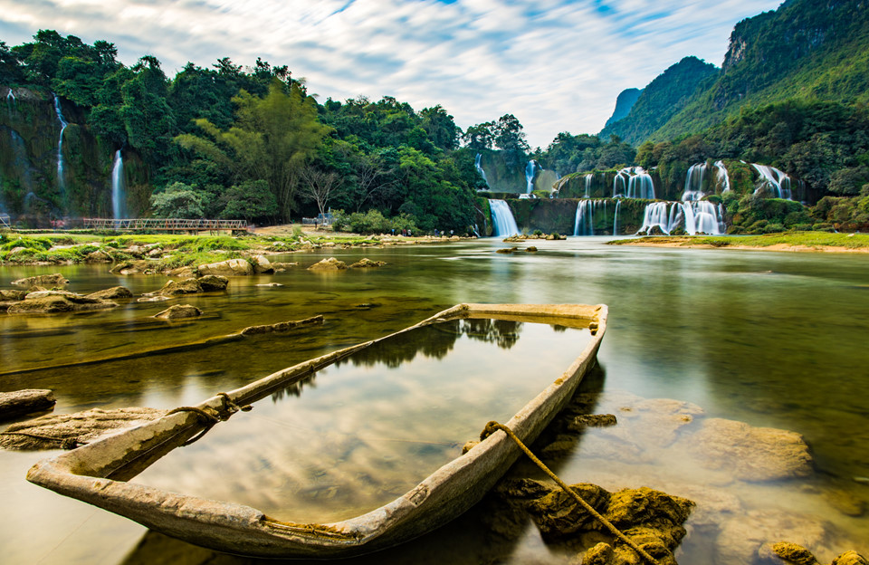 | Thác Bản Giốc nằm trên sông Quây Sơn, miền biên giới giữa Việt Nam và Trung Quốc. Nhìn từ dưới chân thác, phần thác bên trái thuộc chủ quyền của Việt Nam thuộc tỉnh Cao Bằng, phần thác bên phải thuộc chủ quyền Trung Quốc thuộc thành phố Sùng Tả, Quảng Tây. |