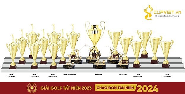 Giải Golf Tất Niên 2023 với bộ cúp giải thưởng đặc biệt nhập khẩu 100% từ Tây Ban Nha, sản xuất theo tiêu chuẩn khắc khe từ Châu Âu. Bộ cúp có màu vàng Gold chủ đạo, được chế tác bằng chất liệu mạ vàng cao cấp, thiết kế tinh tế, sang trọng, hài hòa giữa cổ điển và hiện đại, đa dạng kích thước, phù hợp với từng giải thưởng.