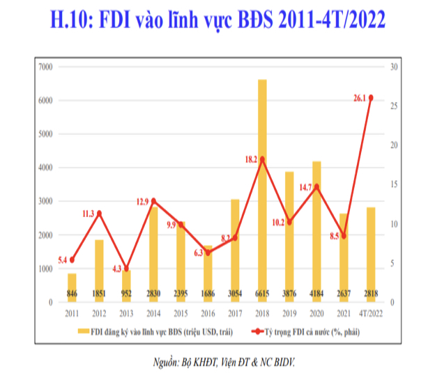 Theo số liệu thống kê phân tích của Bộ KHĐT, tỷ trọng FDI vào lĩnh vực BĐS năm 2011-4T/2022 tăng ổn định.