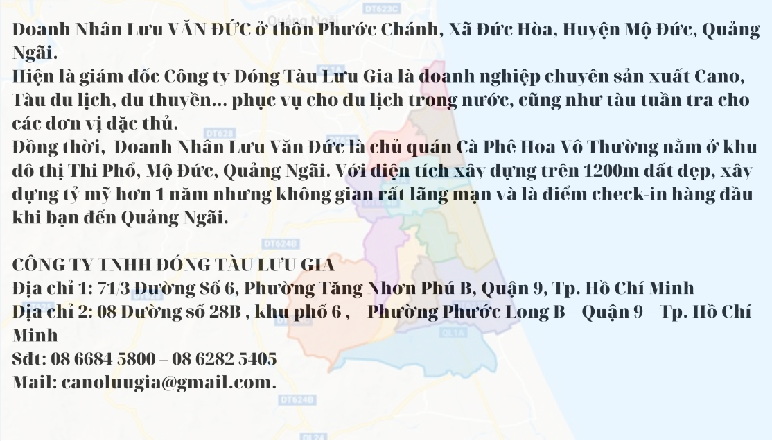 Phải nói, Lưu Văn Đức là một người yêu quê, một tình yêu mang dáng dấp của doanh nhân, mọi thứ đều bắt nguồn từ sự dựng xây, thay đổi. Mọi ngóc ngách qua câu chuyện làm ăn, lời kể của một kỹ sư, đóng tàu thuyền đều phảng phất “mùi vị” của quê hương, văn hóa, lịch sử và một sự tìm kiếm những thứ mới mẻ từ công việc kinh doanh của bản thân mình. Lưu Văn Đức cho biết: “Ý định phát triển tuyến du lịch của Quảng Ngãi đã ấp ủ từ lâu rồi. Vừa qua, tôi cũng có nhiều thời gian để nghiên cứu về vấn đề phát triển các tuyến sông dọc biển ở Quảng Ngãi. Từ Đức Lợi về cầu Trà Khúc, tuyến sông khá đẹp không thua bất cứ con sông nào ở các tỉnh khác trong cả nước. Tại sao không phát triển tuyến sông này. Vì Quảng Ngãi đang có nhiều dự án về các khu du lịch sinh thái đang trên đà phát triển...”