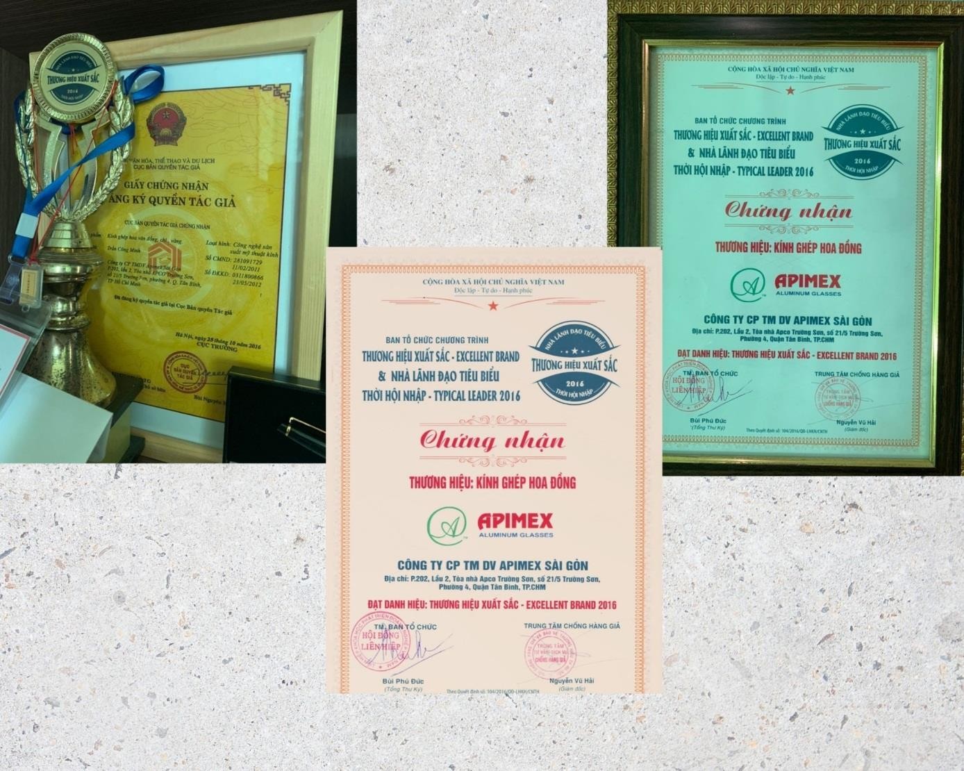 Các giải thưởng, giấy chứng nhận của Công ty Apimex và giấy chứng nhận về tranh ghép kính nan đồng của Trần Công Minh.