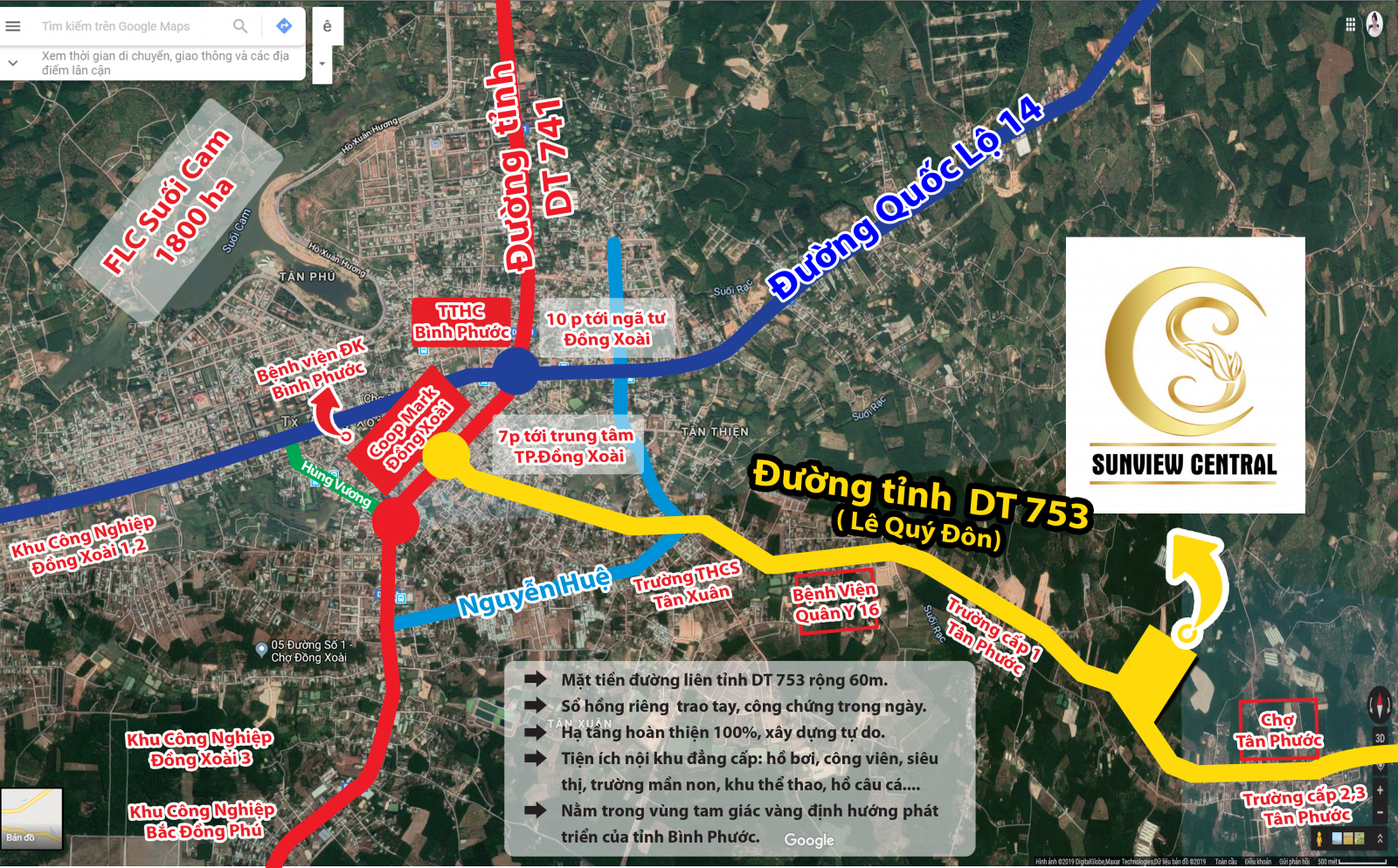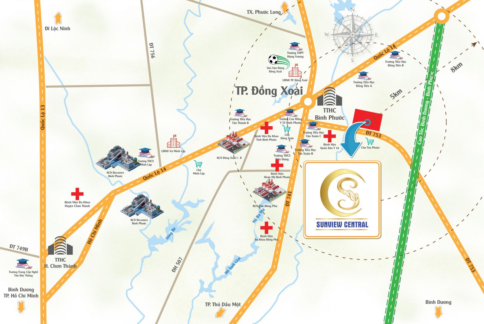 Sunview Central, thuộc ấp Phước Tân, xã Tân Phước, huyện Đồng Phú di chuyển đến TP. Đồng Xoài, với tuyến đường tốt nhất: ĐT 753: 28km. Trong khi đó, khi di chuyển từ Sunview Central về Trung tâm thành phố Quận 1 (2h) qua trục đường ĐT 753. Lợi thế đầu tiên: Sunview Central sẽ rất HOT, trên đoạn đường tâm điểm và di chuyển về các Thành phố lân cận trong bán kính 10 km. Từ khu dân cư đi về phía cao tốc Bình Dương – Bình Phước (8km). Và cách Trung tâm hành chính Bình Phước có 5km.