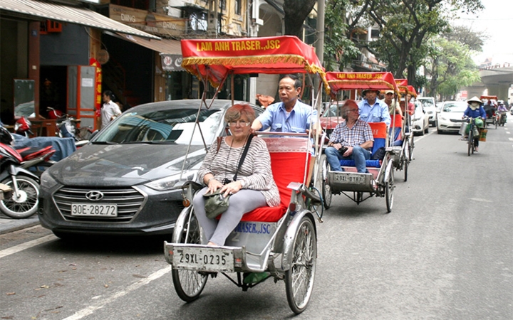 Tiếp theo, du khách có thể tham quan khu phố cổ bằng xích lô với giá 50.000/giờ. Ngồi trên xích lô đi qua các con phố cổ, du khách có cơ hội được nhìn ngắm phố phường Hà Nội một cách chân thực nhất. Hình ảnh những chiếc ghế nhựa có mặt khắp nơi cùng hàng người nhâm nhi cốc trà chanh đá bên vỉa hè rất dễ bắt gặp. Nếu du khách đã mệt, chỗ ngồi nơi đối diện Nhà thờ là một điểm nghỉ ngơi lý tưởng.